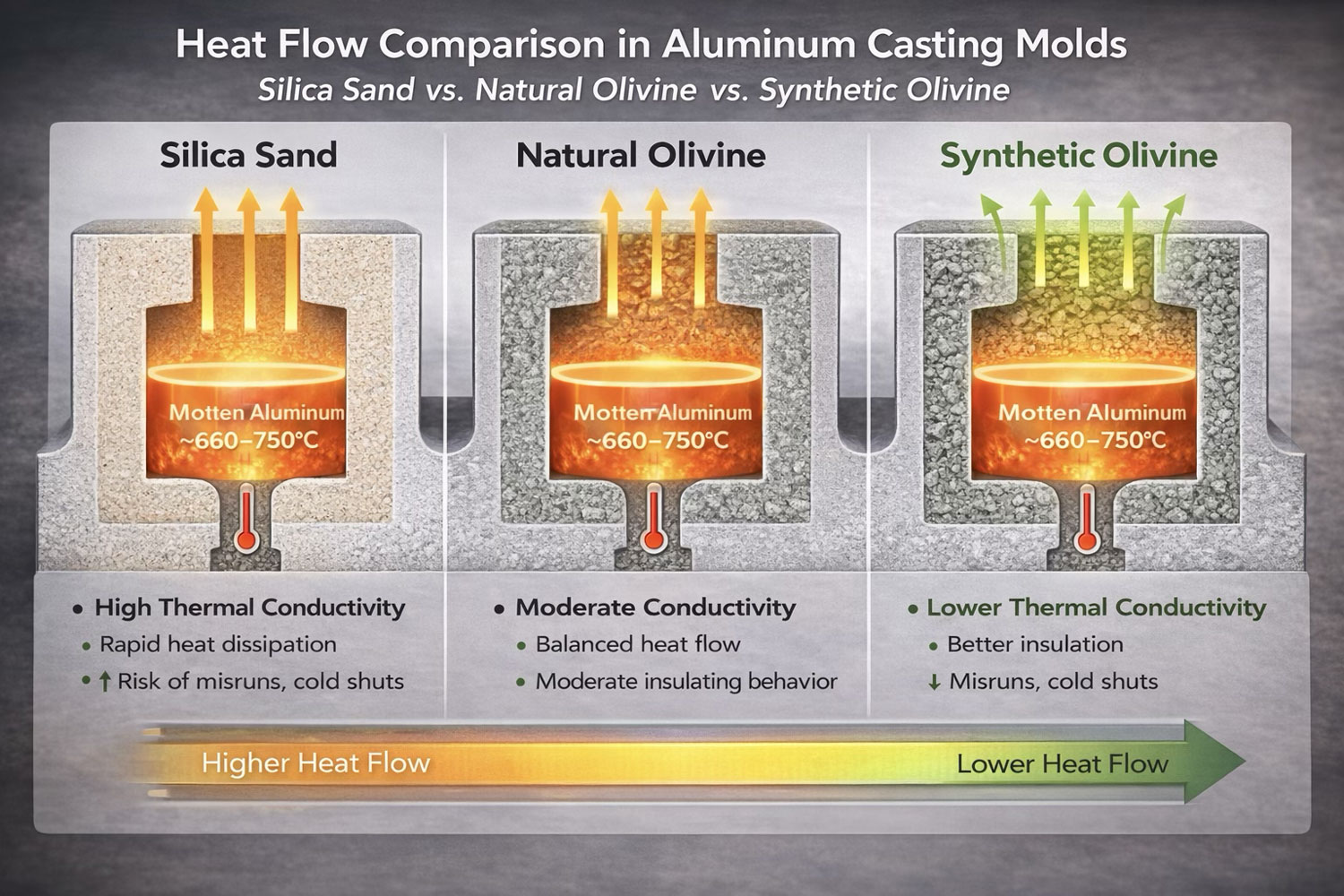 Natural olivine can contain variable amounts of iron oxide, chromite, clay minerals and trace contaminants which can cause gas evolution and surface reactions with molten aluminum. Synthetic olivine sand provides several advantages over natural olivine and silica when casting aluminum. These benefits come from controlled chemistry, lower impurities, and more consistent grain structure, which improves surface quality and reduces gas-related defects.
